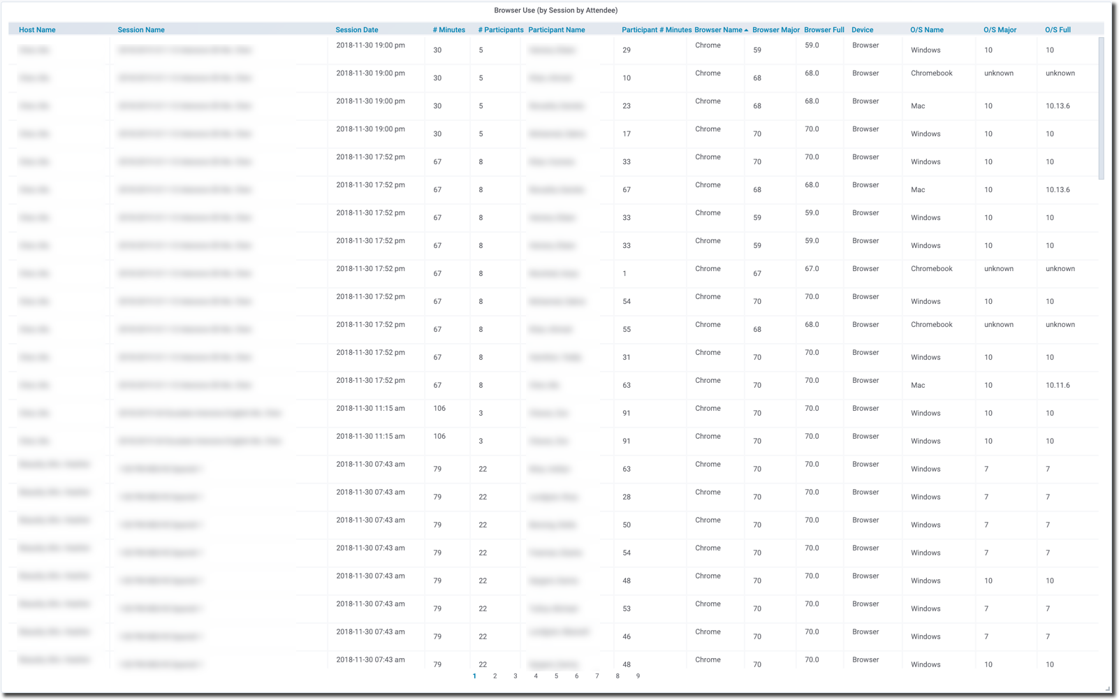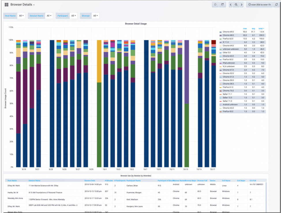 Included, at the bottom of this Dashboard, is a table that shows the Participant/Attendees for each Session along with their browser detail information.