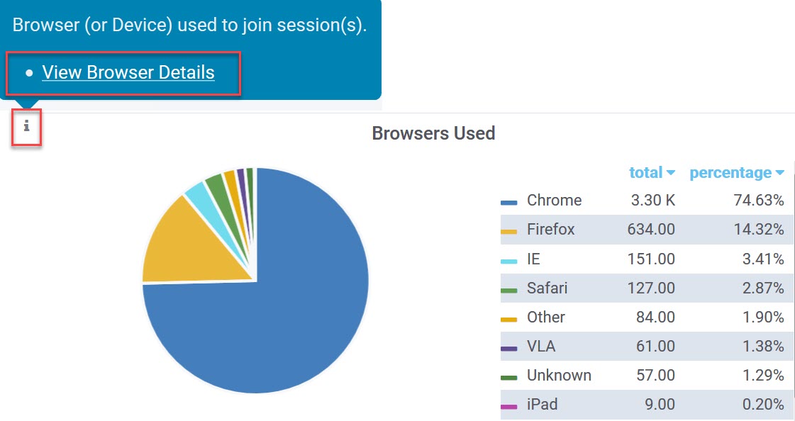 The Browser Used panel shows the Browsers (or devices) used to join Session(s)