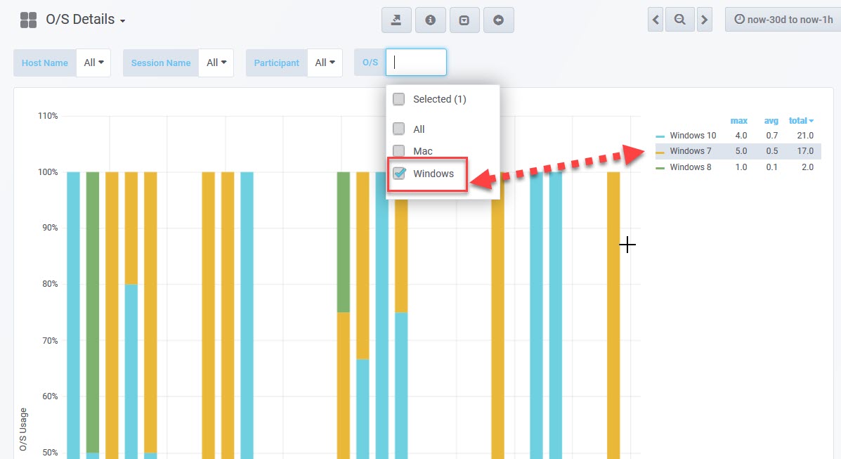 Additional filters (and even a different date range) can be applied on this dashboard. For example, to see only "Windows" info, select "Windows" from the "O/S" filter.