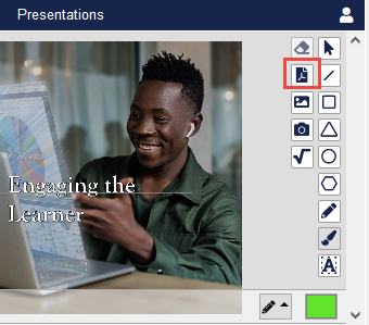To use the laser pointer on a Presentation, click the Laser Pointer icon in the bottom right of Pane 2 when the presentation is open.