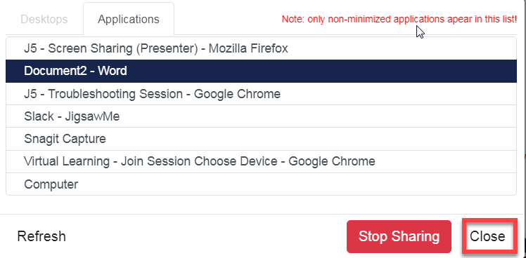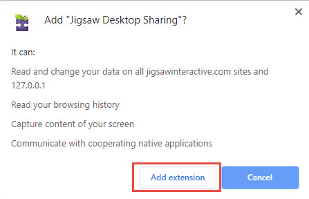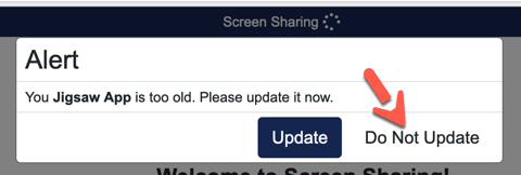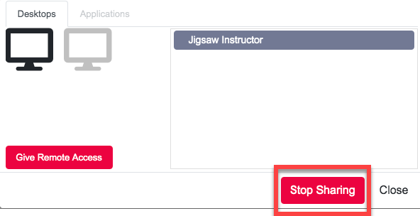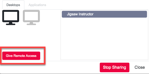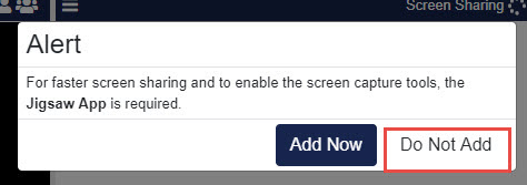 It is possible to screen share in Jigsaw using only the browser (without installing the Jigsaw App). You will not have such functions as Remote Access, Copy/Paste in Pane 2 and Whiteboard, or Insert Screenshot from Pane 2 and Whiteboard. You will have the option to include Audio if using Chrome or Edge.
