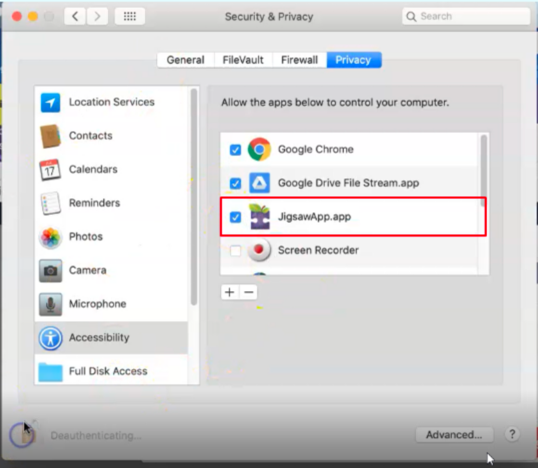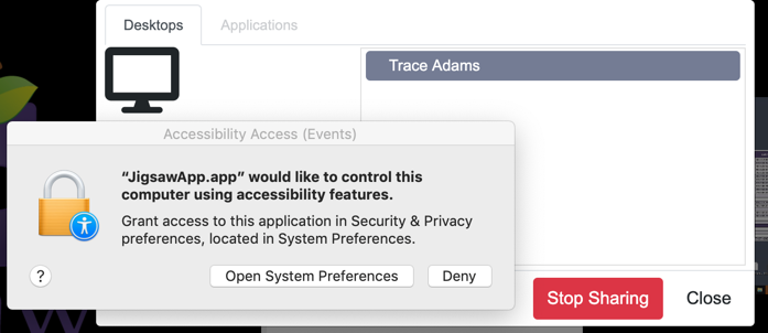 Note for Mac Users: When using Remote Access, Mac Users have to ALLOW the Jigsaw App in their accessibility settings.