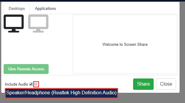 For audio to be heard by attendees when screen sharing, the user screen sharing will check the box next to Include Audio.