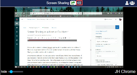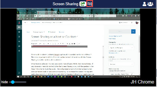 This will prevent an echo from being heard when mics are turned back on and users are speaking. To continue the Screen Sharing with audio, have users turn off their mics and click the Speaker Button to turn audio back on.