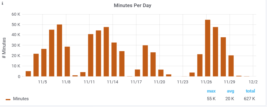Each bar on the chart represents the number of Minutes that all Attendees attended during all Sessions held per day. The y-axis (numbers up the left side) show the number of Minutes. ("K" = thousands)