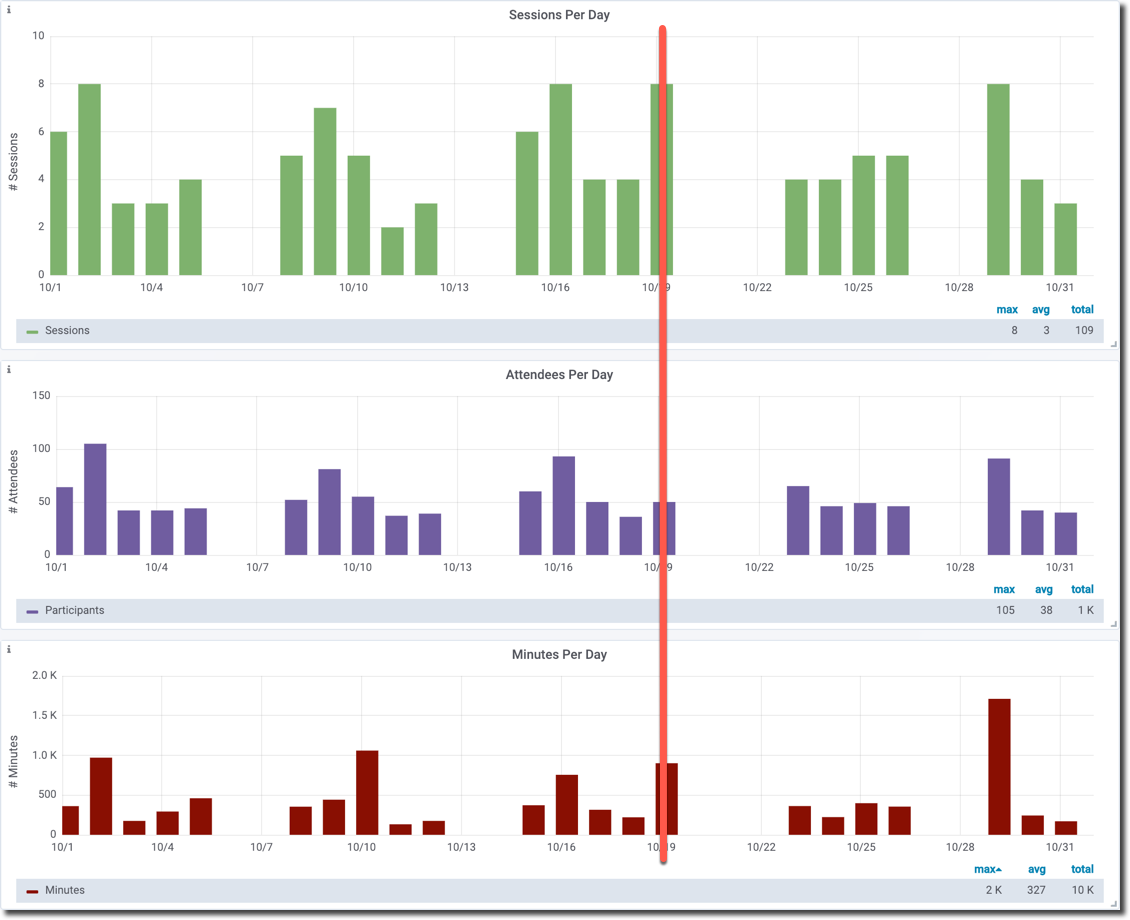 It can also be useful to draw an imaginary line across the "Sessions Per Day", "Attendees Per Day" and "Minutes Per Day" charts, for a specific date. In this one view, you can then see how many sessions were held, how many people attended, and how many minutes they spent.