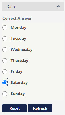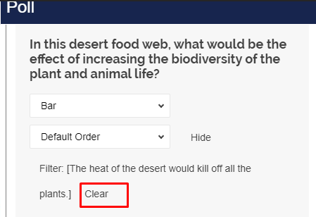 - Using the filters, the Host/Co-Host can reduce the graph to just one bar/answer or clear it to return the complete set of answers/responses. This is controlled by the following menu (or have the option to click directly onto the graph to filter).