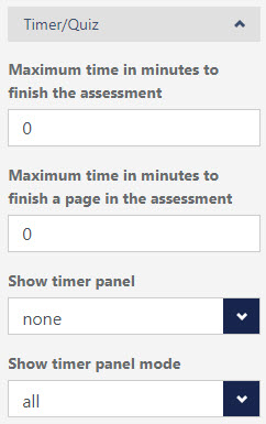 4. Finally, move to the Timer/Quiz section. Here you can enter the maximum time for each page and/or the entire Assessment to be finished. You can also select if this will be shown to Attendees at the top or bottom of the Assessment (Show timer panel), as well as if the total amount of time left is shown for the page or the Assessment (Show timer panel mode).