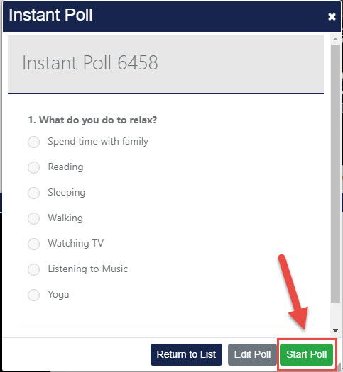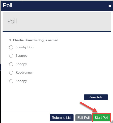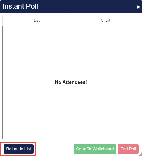 To return to the Poll List, click Return to List. Click another Poll to release one or click the X in the upper right corner to close the Poll window.