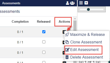 - For Evaluations, Surveys, and Quizzes, click the down arrow under the Actions column for the Assessment in Pane 3. Select Edit Assessment.