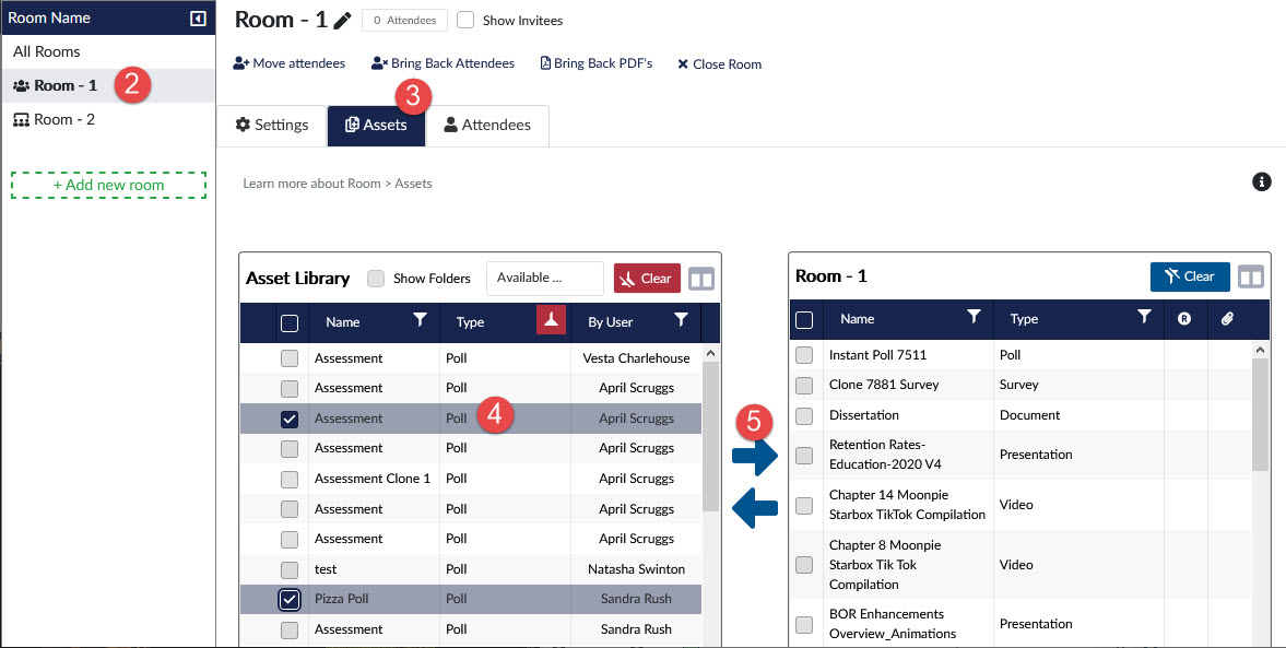 4. From the Asset Library, select the Poll(s) to add to the Room Assets