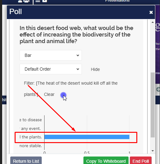 - After releasing the poll and then viewing the “Chart”, click on one of the responses represented on the bar chart to filter in on a single response.