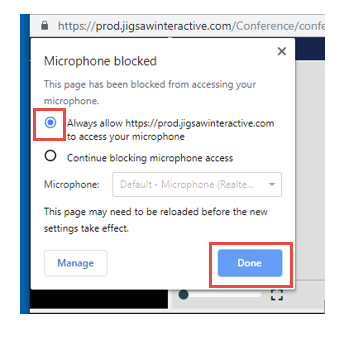 With just a few clicks, you can tell your browser to allow your mic and web cam in these sessions.