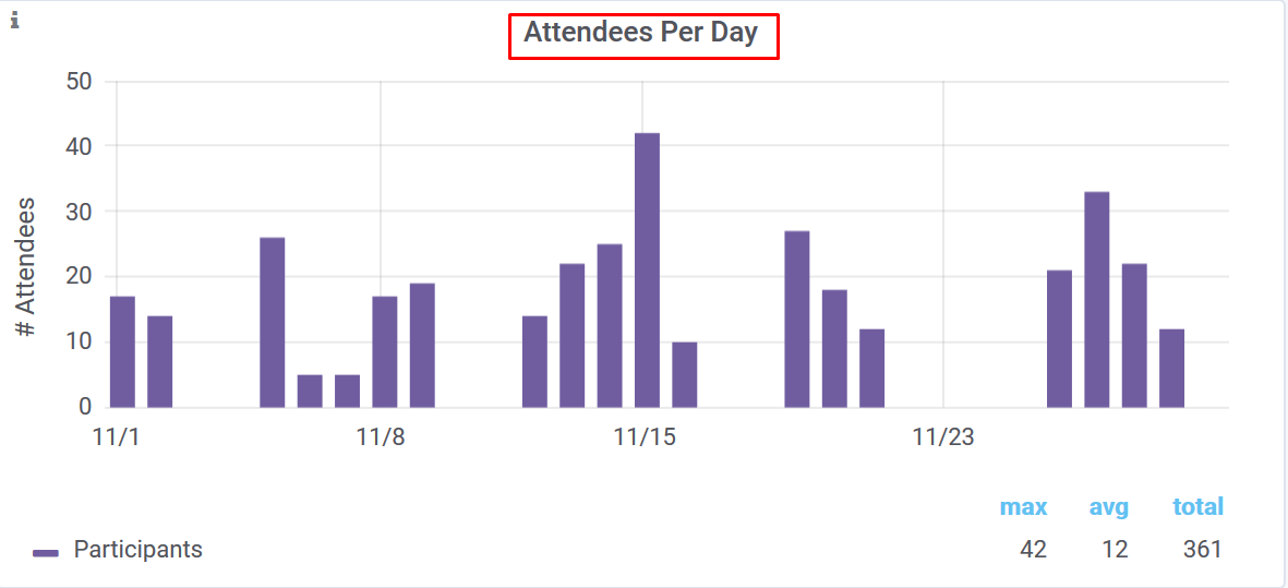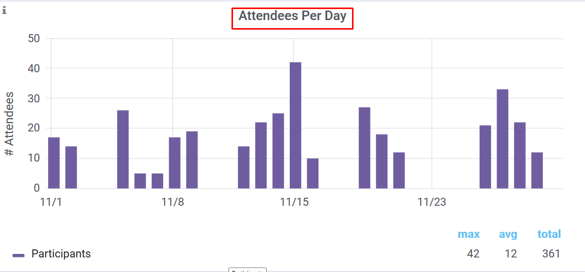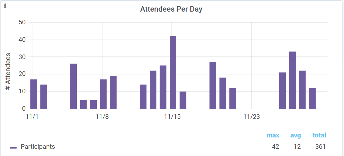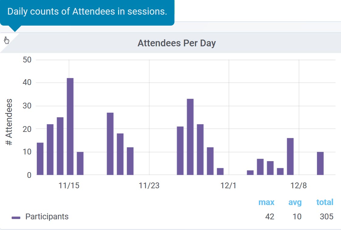 This chart is most useful if you use the Filters (at the top of the Dashboard) to filter for one specific Host/Teacher and/or one specific Session/Class. If, for example, you filter for one specific session, this chart will show you the attendance for each day that session was held.