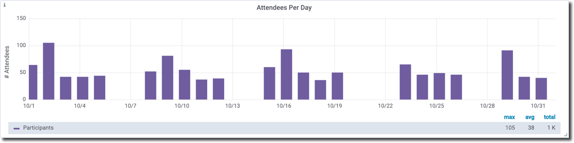 It can also be useful to draw an imaginary line across the "Sessions Per Day", "Attendees Per Day" and "Minutes Per Day" charts, for a specific date. In this one view, you can then see how many sessions were held, how many people attended, and how many minutes they spent.