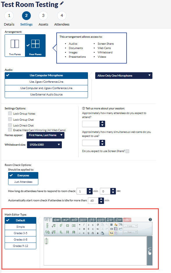 Once a company or institution has added the Insert Equation Tool, Hosts are able to select the MathEditor Type on the Settings screen (Screen 2) when setting up a session. This can be changed after a session has been created.