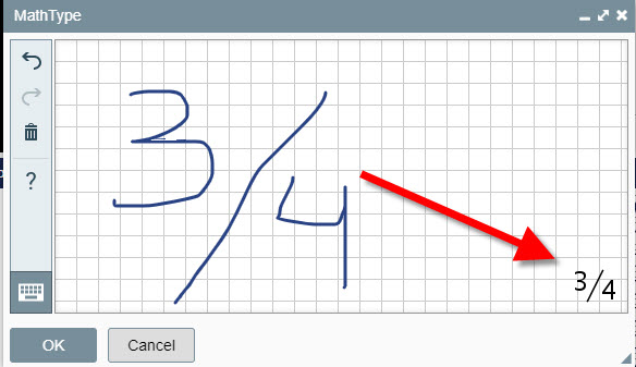 2. Using the mouse or the screen (if touchscreen-capable), draw on the MathType screen. MathType will translate what you have drawn/written into text.