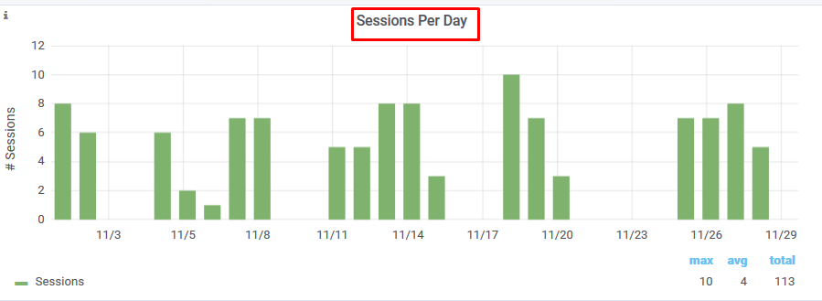 Sessions Per Day panel displays the number of Sessions held each day.