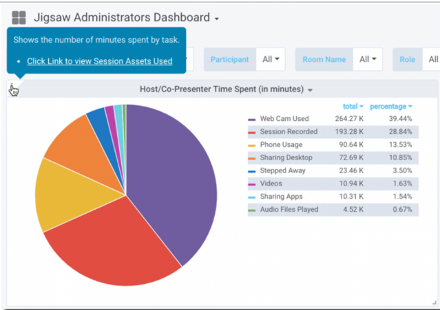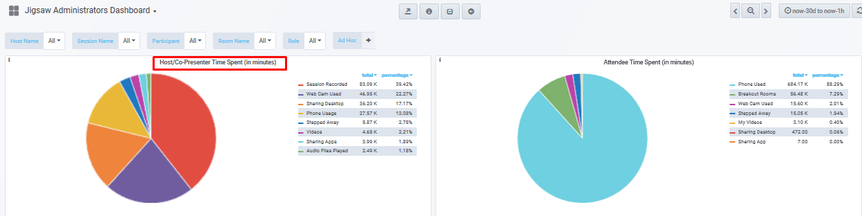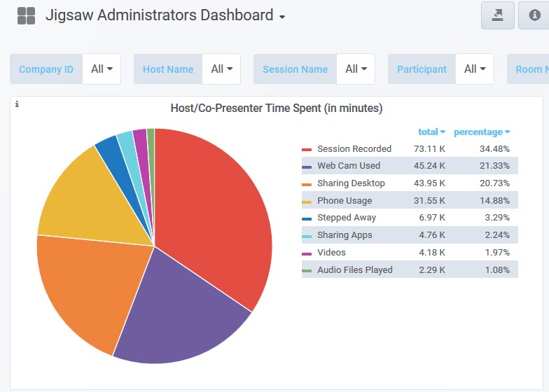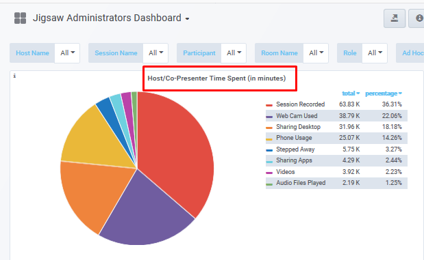 The Host/Co-Presenter Time Spent(in minutes) panel displays the number of minutes spent by feature.