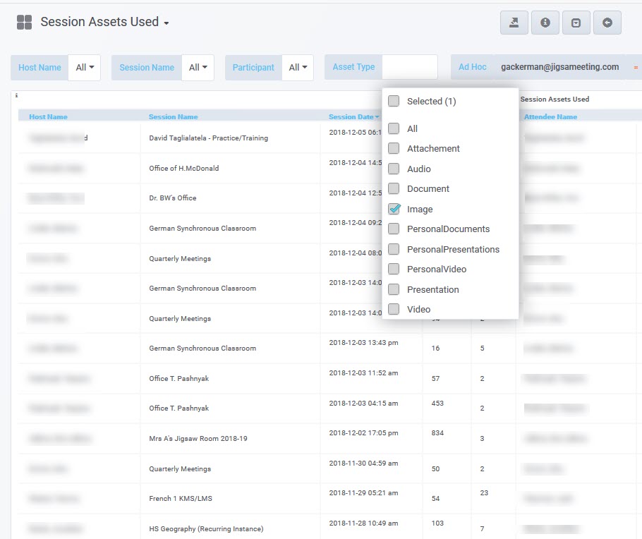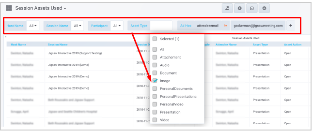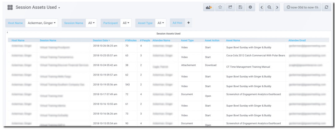 This will take you to the "Session Assets Used" drill-down dashboard. It shows all of the typical Session information, as well as the Attendee who interacted with the Asset, the Type of Asset, and the "Name" of the Asset