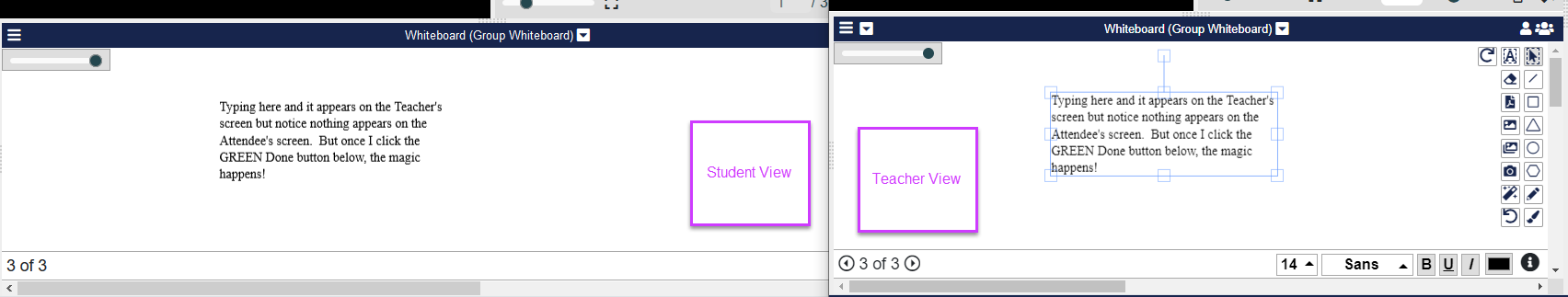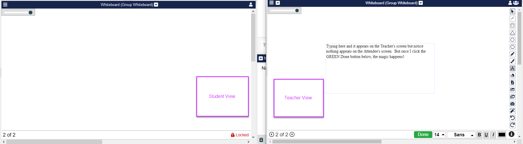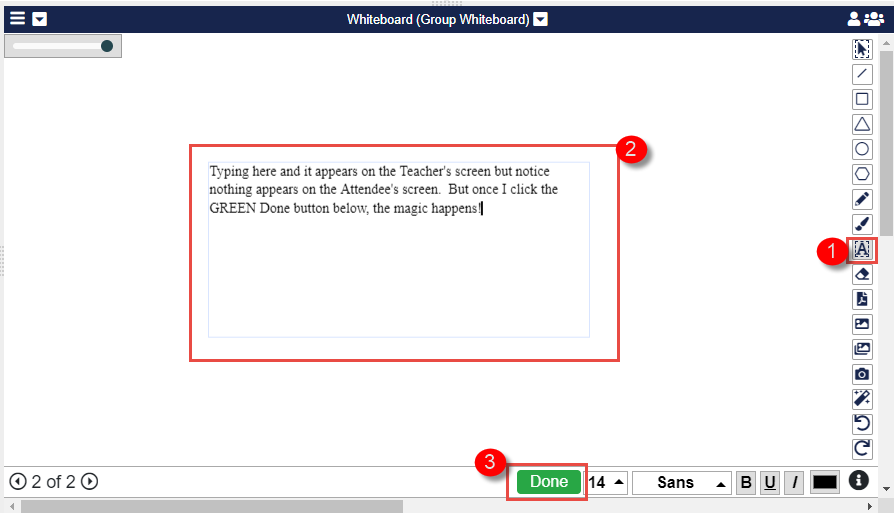 Have you ever found yourself using the Text Box tool on the Whiteboard only to have your attendees say they cannot see what you are typing?  You are not alone.  We all have had that happen and it is actually working as it is meant to on the Whiteboard.  See, there is this little green Done button at the bottom of the Whiteboard that we have to click before the text will appear for anyone else.  Let me show you.